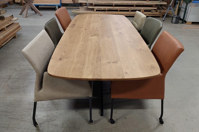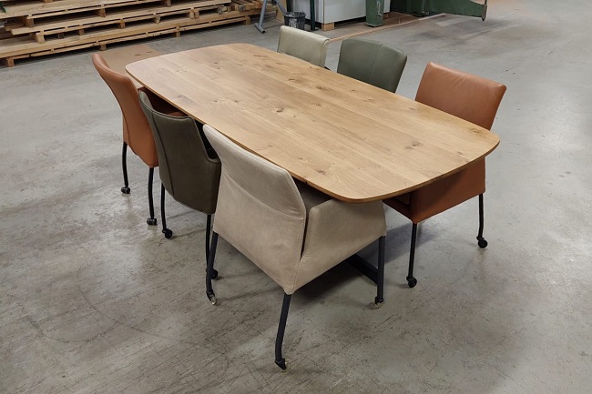 6 eetkamerstoelen met parketwielen en armleuningen in combinatie stof model Max van € 2154,- voor € 1695,-