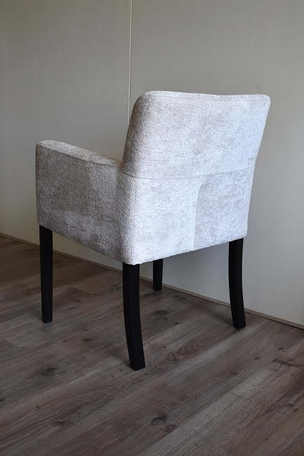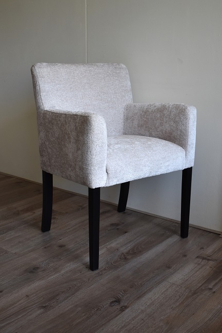 1 stoel Roos met armleuningen en houten poten in lichte zachte stof Feel Me van € 409,- voor € 195,-