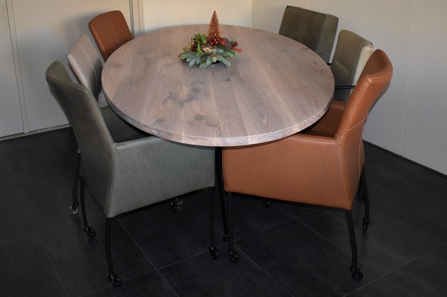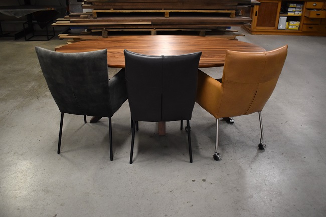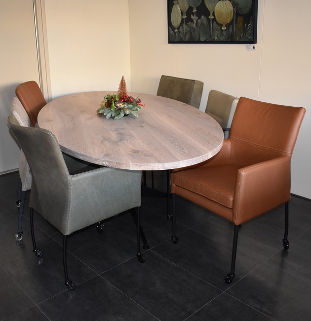 6 verschillende leren eetkamerstoelen met wieltjes en armleuningen voor € 1195,-