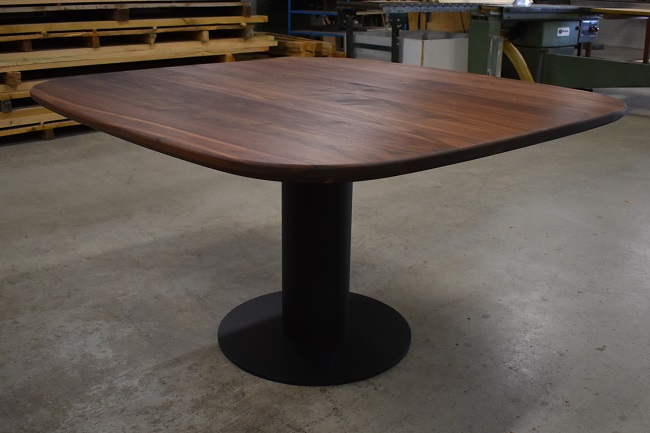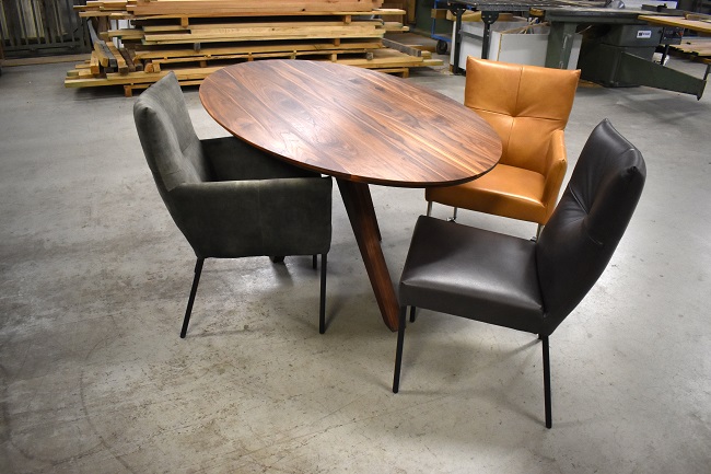 Ronde notenhouten tafel 140 cm. met stalen spinpoot € 1895, –