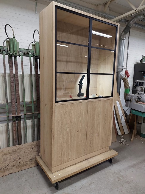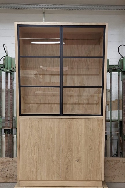 Vitrinekast op maat met zwart stalen deuren model Maurik in eikenhout