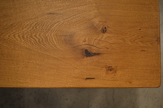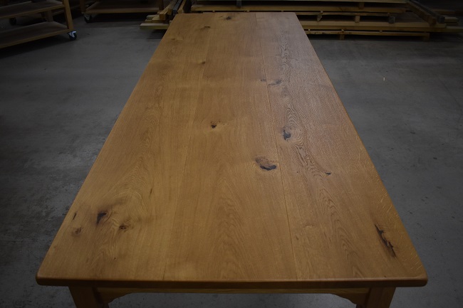 Het tafelblad is uitgevoerd in 2,8 cm. massief rustiek eikenhout.