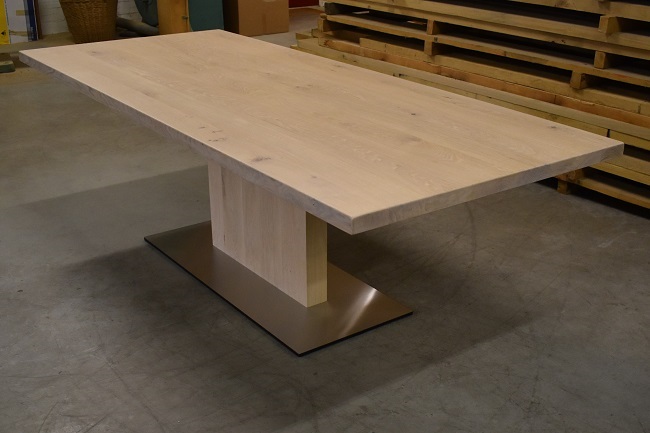 Tafelonderstel met rvs vloerplaat en eiken kolom € 495,-